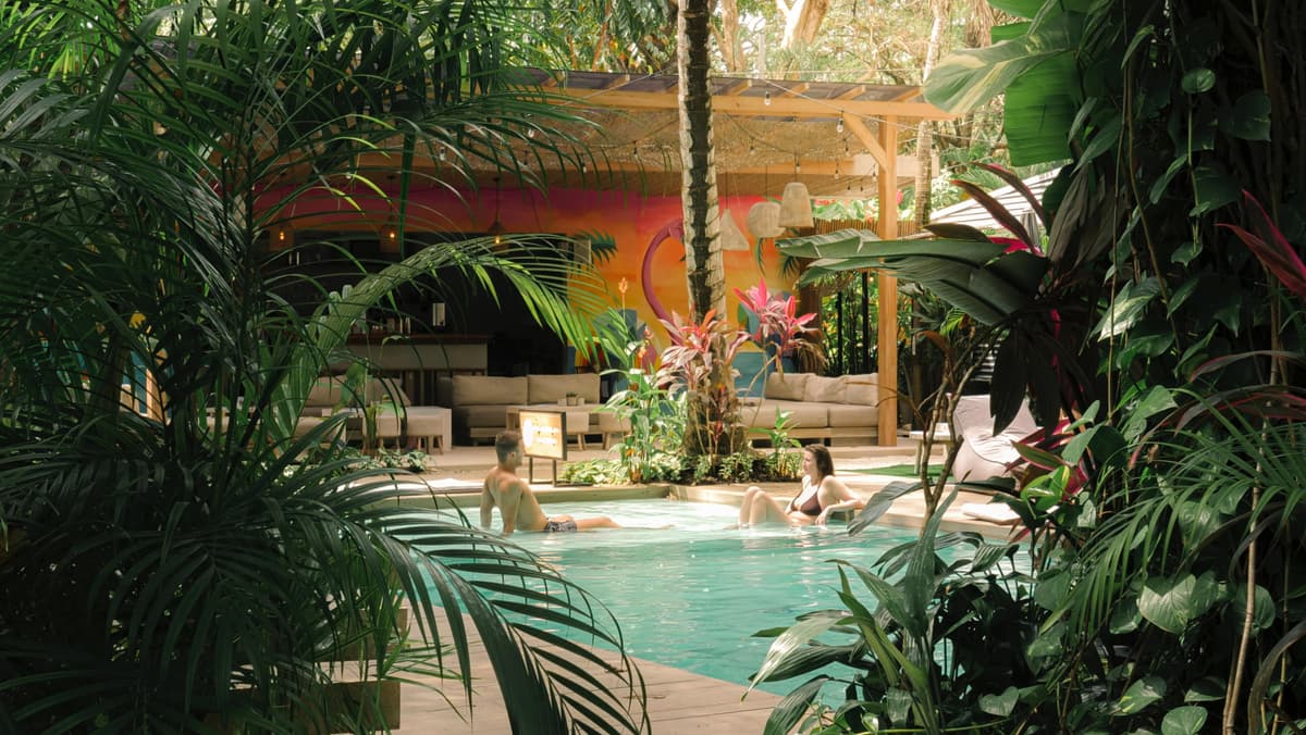 Centrally located within our tropical garden, find our lagoon-style waterfall pool. Just steps from the bungalows it offers shady chill-out zones and other places to rest, siesta or hold group sessions.