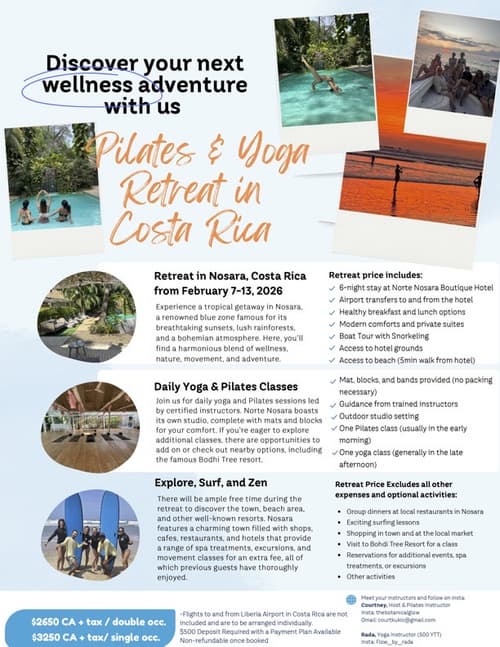 Spend seven unforgettable days immersed in yoga, Pilates, sunshine, and pura vida energy. Each day offers movement classes, nourishing meals, and time to relax or explore the beauty of the jungle and beaches. This retreat is your chance to recharge, connect with community, and return home feeling stronger, lighter, and deeply renewed.